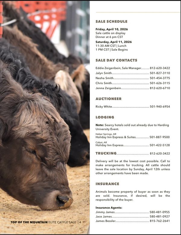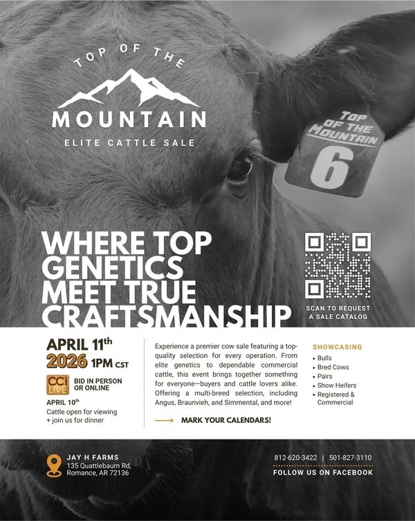 We will offer cattle in the Top of the Mountain Sale April 11, 2026 in Arkansas. Keep watch for catalog or sign up for one