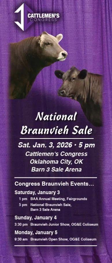 Sale Saturday, Jan. 3, 2026 OKC Fairgrounds, Oklahoma City 3001 General Pershing Blvd., Oklahoma City, OK 73107 Barn 3 Sale Arena & Meeting Room 1 p.m. BAA Annual Meeting 5 p.m. National Braunvieh Sale Sale Committee Eddie Zeigenbein, Chair(812) 620-3422